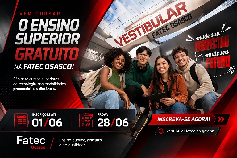 As inscrições para o processo seletivo das Faculdades de Tecnologia do Estado de São Paulo (Fatecs) estão abertas até 1 de junho, exclusivamente pelo site vestibular.fatec.sp.gov.br. Para o segundo semestre de 2026, as Fatecs oferecem um total de 18.505 vagas, sendo 13.875 para ingresso via Vestibular e outras 4.630 destinadas aos candidatos do Provão Paulista. A taxa de inscrição é de R$90. O exame será aplicado no dia 28 de junho, às 13h.